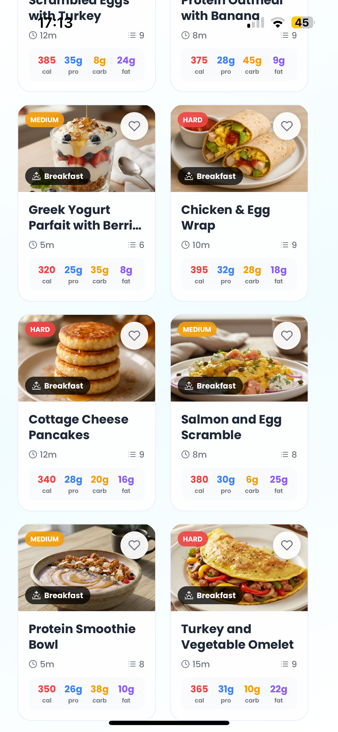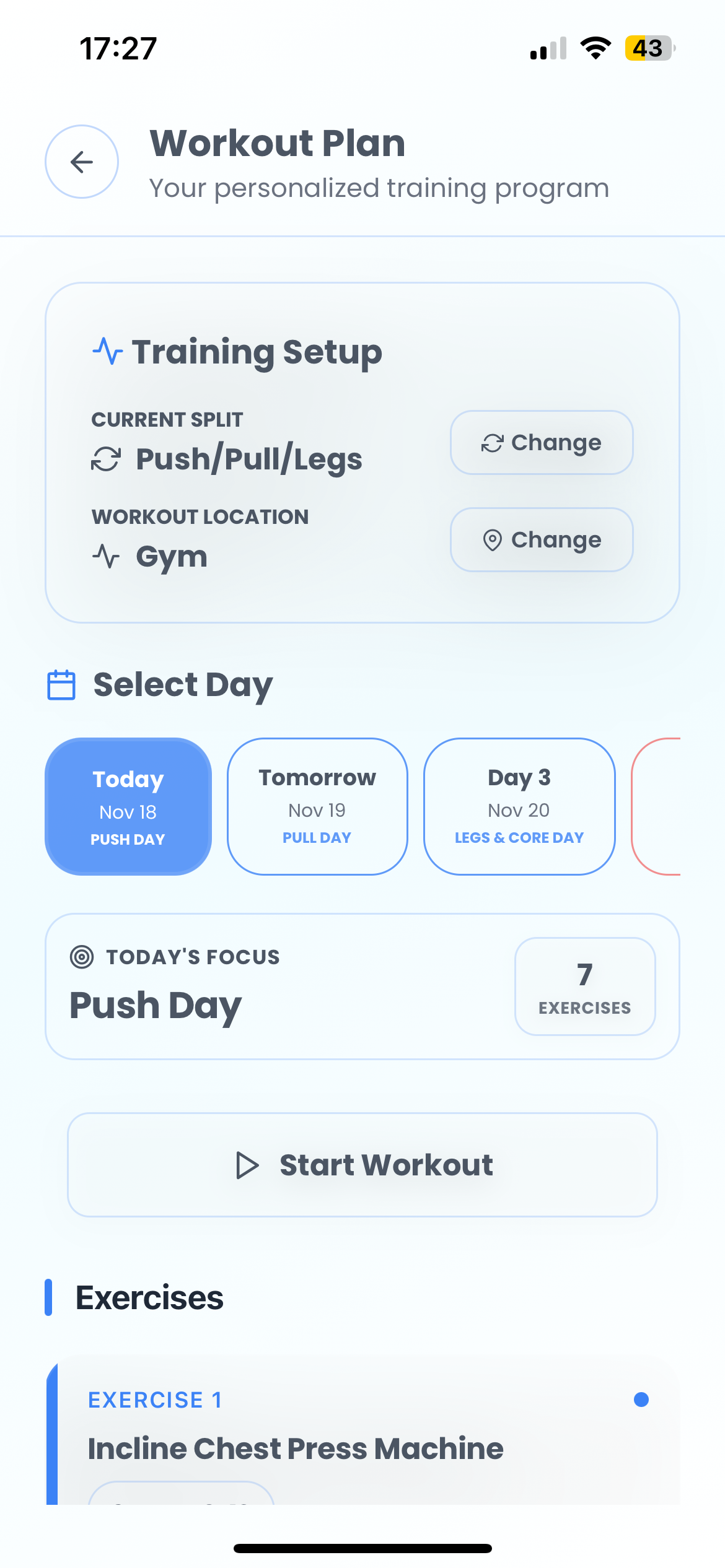 Fully personalized meal generation with customizable portion sizes for breakfast, lunch, dinner, pre workout, post workout, and snacks throughout your day.
